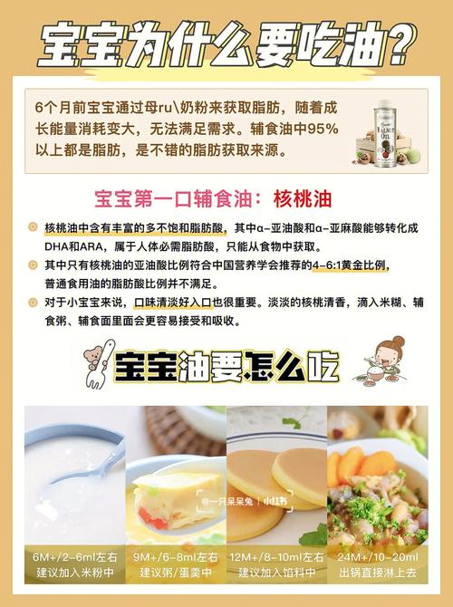 对于 1 岁及以上的婴儿,以下油类是不错的选择:橄榄油:富含单不饱和脂肪,有助于预防心脏病。菜籽油:也是单不饱和脂肪的良好来源,还含有 omega-3 脂肪酸。鳄梨油:富含单不饱和脂肪、omega-3 脂肪酸和维生素